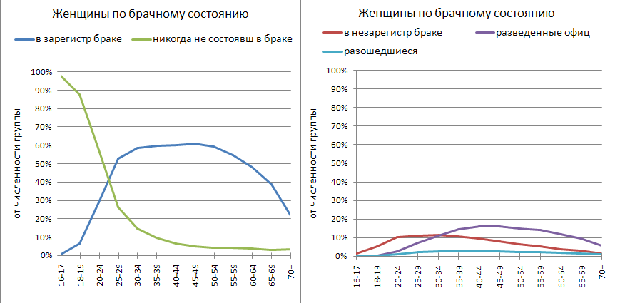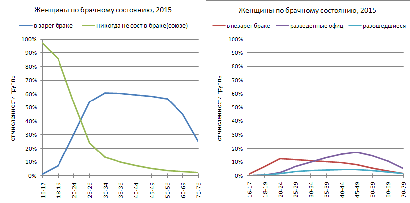 Вот и ещё один миф - о том, что официальных браков мало потому, что они заменяются неофициальными. По факту в официальных и неофициальных союзах к 40-летнему возрасту находятся около 70% женщин и 75% мужчин (за счет повышенной смертности последних). А теперь зададимся вопросом: откуда возьмется рождаемость, если в основных репродуктивных возрастах в законном браке находятся менее 60% женщин? Рожать без мужа? На свою-то минимальную зарплату? Такие подвиги закончились вместе с СССР.