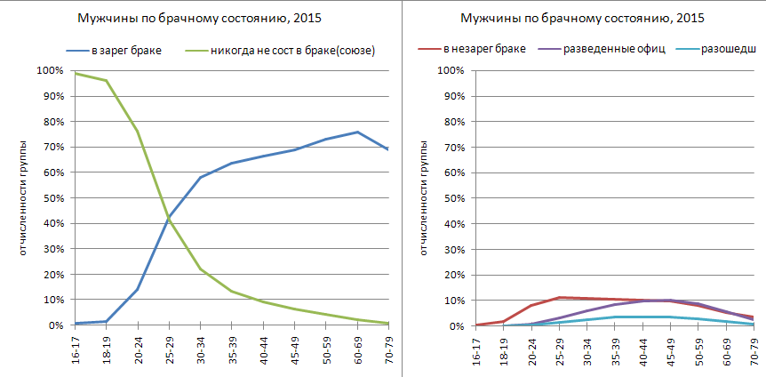Но, скажете вы, возможно, люди не заключают браки, потому что они уже в браке? На этот вопрос ответ дают переписи населения 2010 и 2015 годов (в разбивке по возрастным группам).