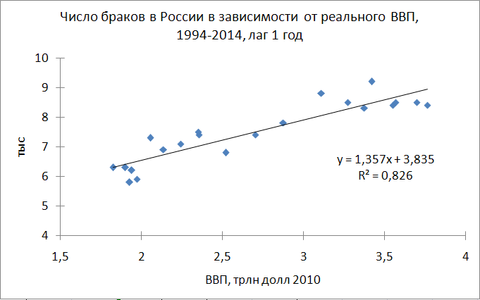 Как видим, сказки наших чиновников о том, что якобы женщины не рожают, потому что делают карьеру – это и есть самые настоящие сказки, призванные замаскировать действительность: они не рожают из-за материальных трудностей и неуверенности в завтрашнем дне. А карьера им по большей части безразлична. А вот от чего зависит материальное положение и работа – это мы уже проходили. На диаграмме - число браков на 1000 чел населения в зависимости от реального ВВП: