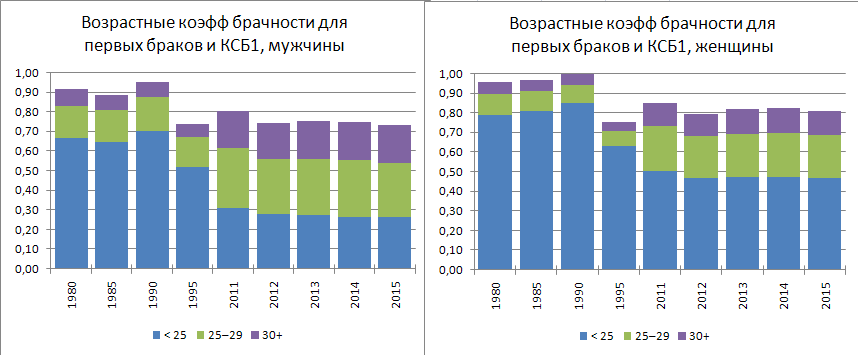 Установившиеся после 2014 значения коэф. суммарной брачности для первых браков (КСБ1) на уровне 0,8 для женщин и около 0,7 для мужчин показывают, что при сохранении текущей ситуации 30% мужчин и 20% женщин никогда не зарегистрируют брак.