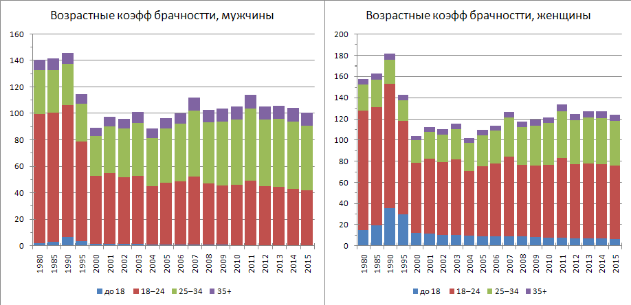 Интенсивность заключения браков в целом отражают возрастные коэффициенты брачности (число браков на 1000 человек данного пола и возраста):