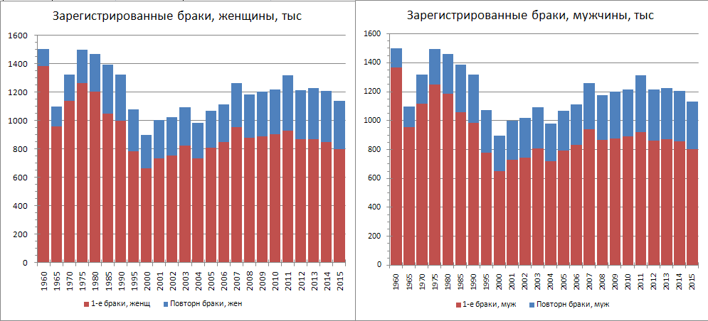 Прояснить ситуацию с семейным положением населения нам помогут данные Росстата по повторным бракам: