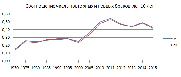 Разность между возрастами заключения первых браков и повторных в среднем составляет 10 лет. Учитывая, что в основном регистрируется не более 2-х браков, оценим долю первых браков, которые, распадаясь, дают повторные:
